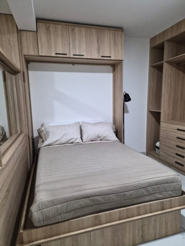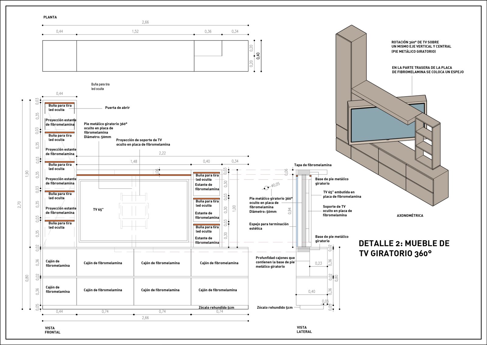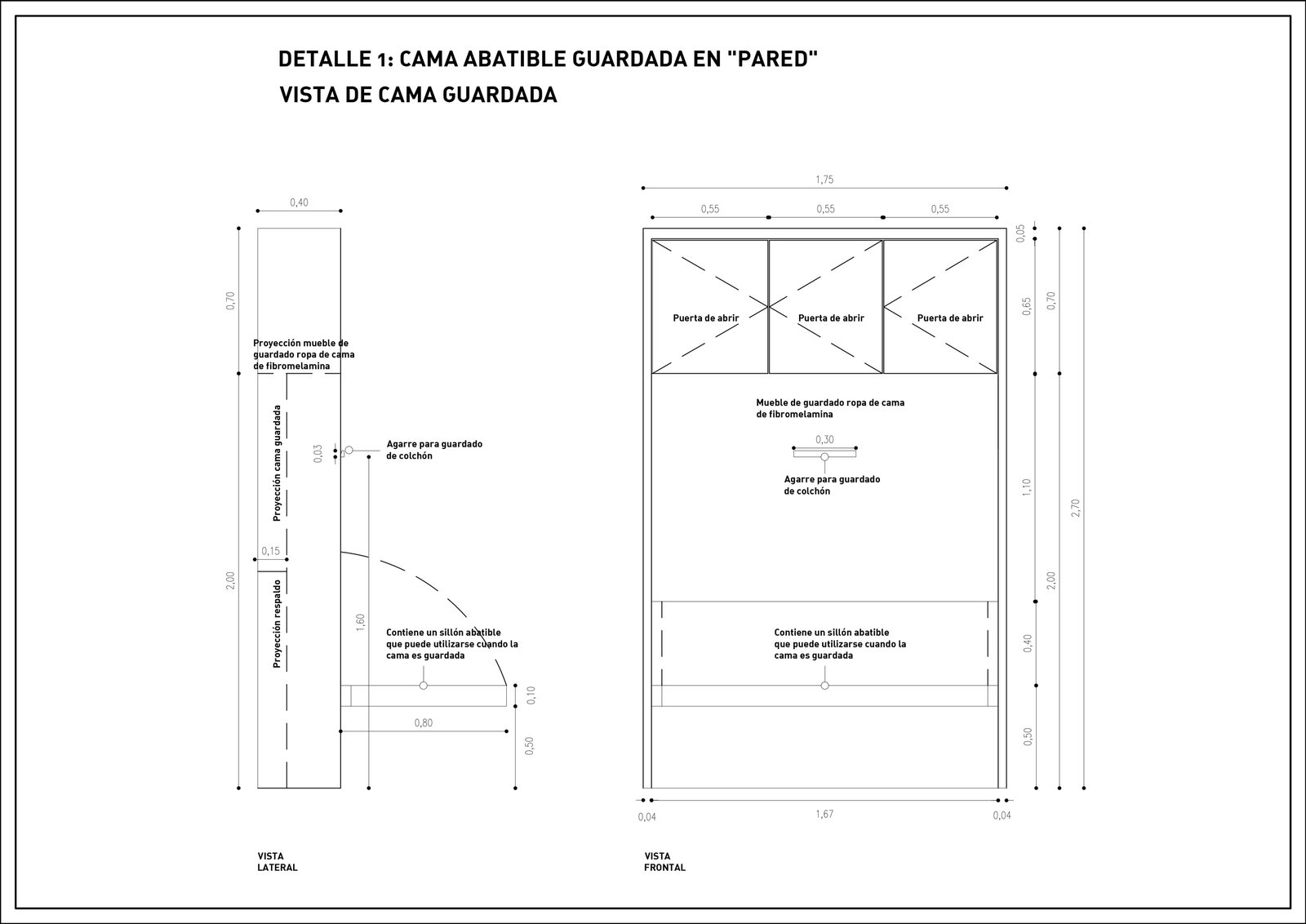 El mueble divisor cumple un rol estructurador del espacio: organiza la cocina-comedor y la zona de descanso sin cerrar visualmente el ambiente. Integra un sistema de televisión con giro de 360°, permitiendo su uso desde ambos sectores. Del lado del dormitorio, el mismo módulo aloja una cama rebatible que puede ocultarse completamente, liberando superficie durante el día y optimizando el uso del espacio. El soporte de cama incorpora además espacio de guardado para ropa blanca.