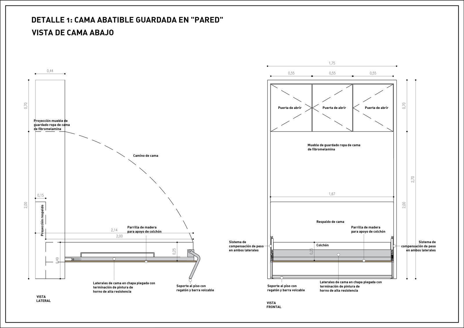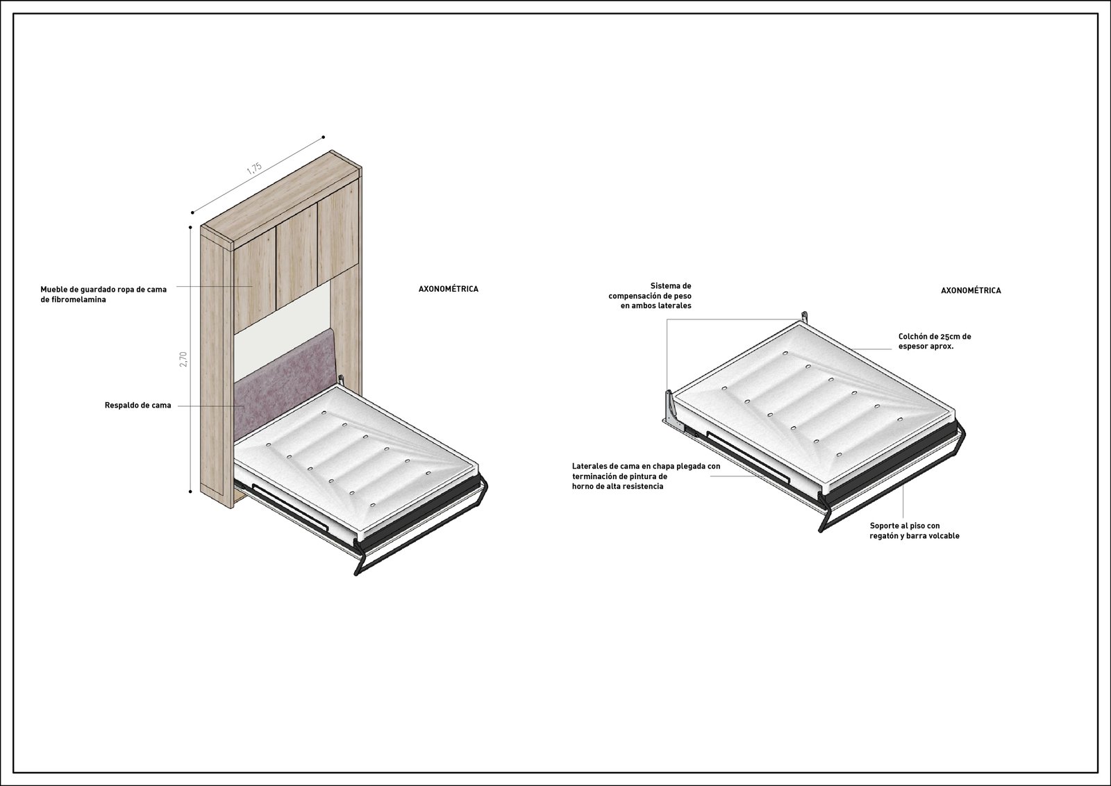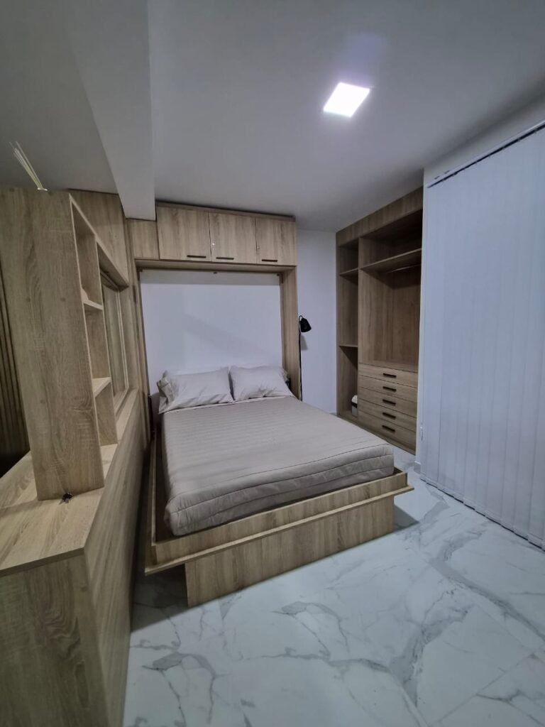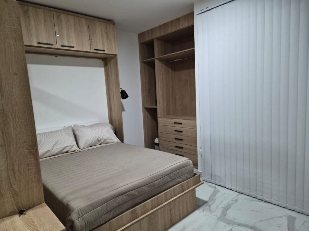 El mueble divisor cumple un rol estructurador del espacio: organiza la cocina-comedor y la zona de descanso sin cerrar visualmente el ambiente. Integra un sistema de televisión con giro de 360°, permitiendo su uso desde ambos sectores. Del lado del dormitorio, el mismo módulo aloja una cama rebatible que puede ocultarse completamente, liberando superficie durante el día y optimizando el uso del espacio. El soporte de cama incorpora además espacio de guardado para ropa blanca.