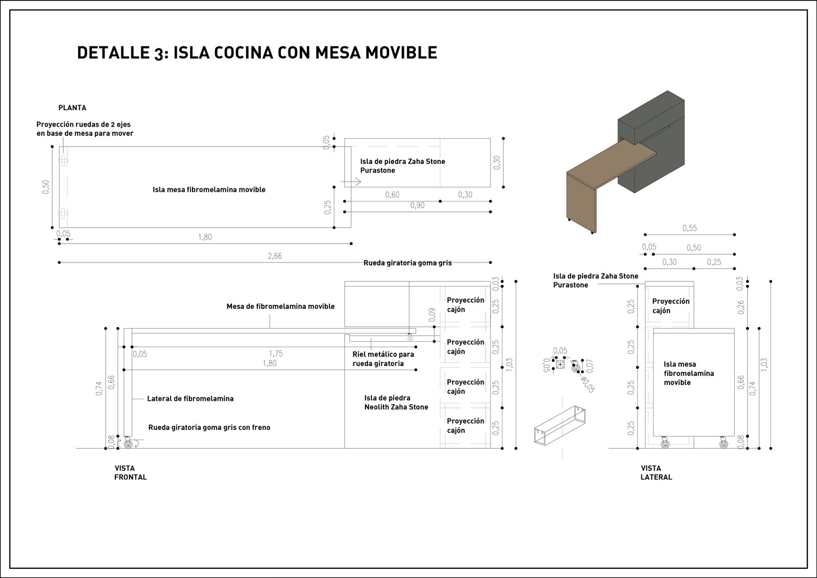 La isla central incorpora una mesa móvil extensible que se adapta a distintas configuraciones de uso, permitiendo ampliar la superficie de apoyo o comedor según la cantidad de huéspedes.