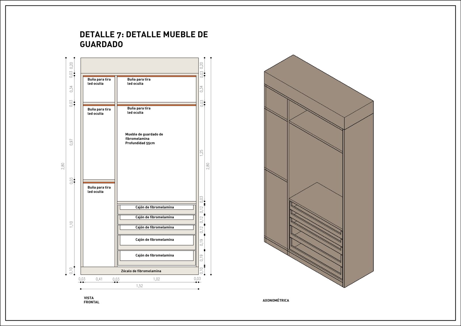 Se proyectó también un armario integrado que mantiene la continuidad material y evita fragmentar visualmente el ambiente.